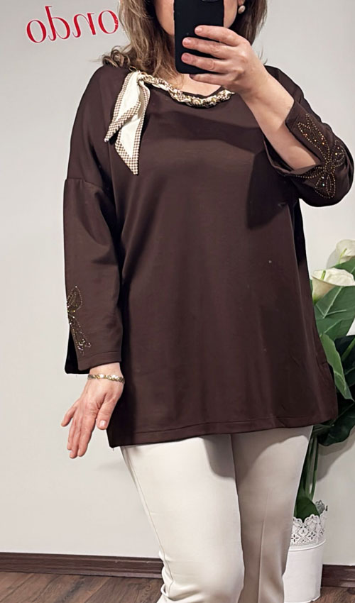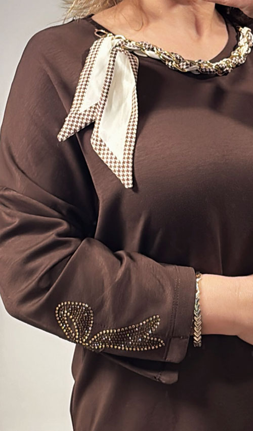 Kol uçları ince taşlı işlemelerle süslenmiş yakası zincir detay ve Fular aksesuarlı Bluz