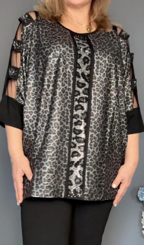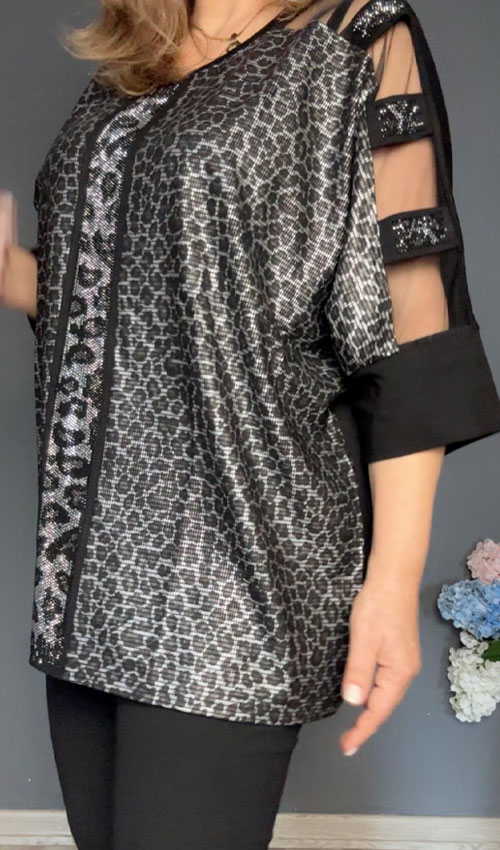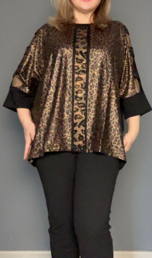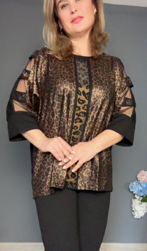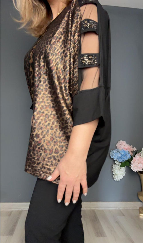 Leopar Desenli Kol Şeffaf Tül Bluz